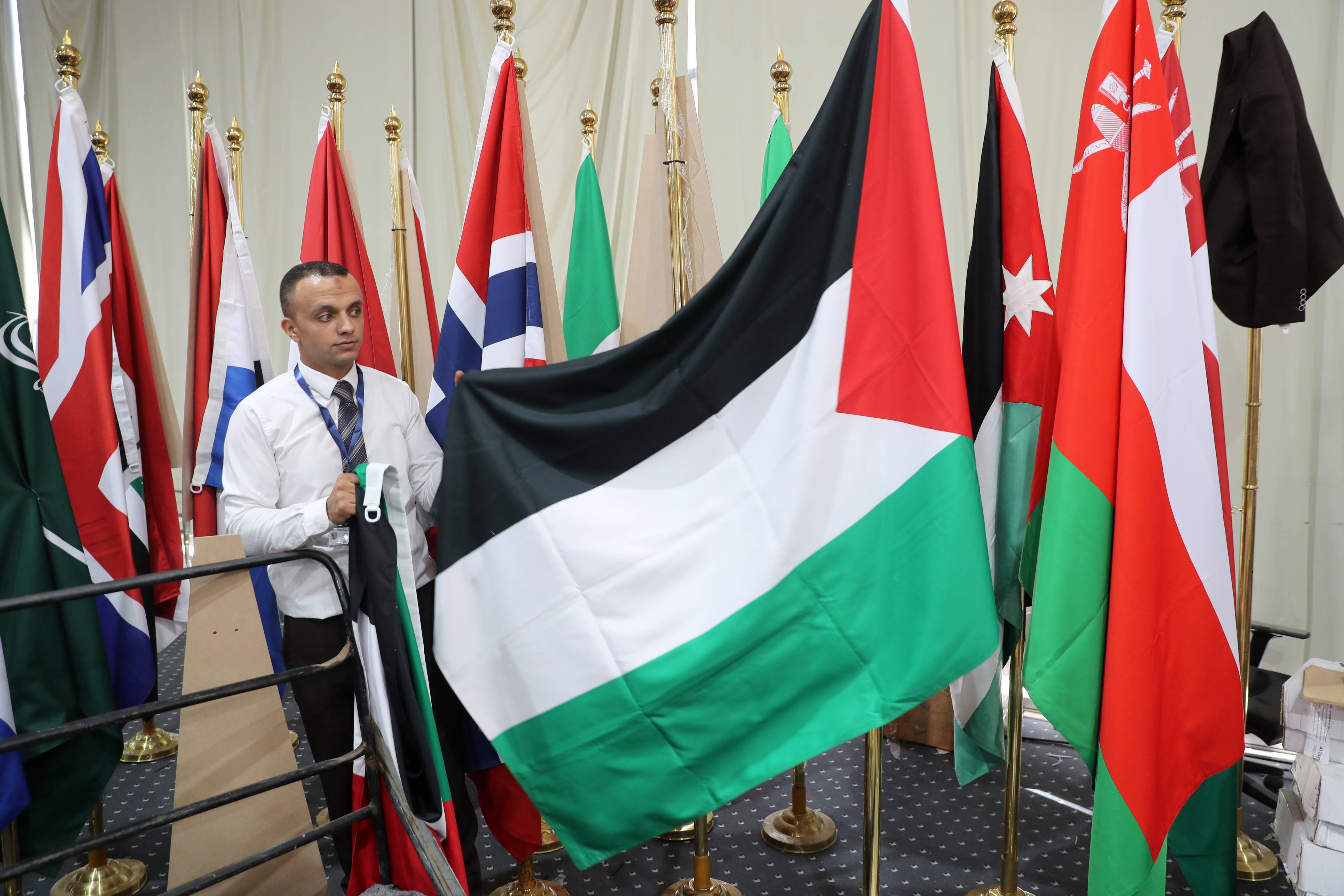 10月13日,在埃及沙姆沙伊赫,一名工作人员在沙姆沙伊赫峰会的媒体中心整理巴勒斯坦国旗。新华社记者隋先凯摄决议提到,若巴勒斯坦民族权力机构进行改革,存在实现巴勒斯坦建国的可能。以色列学者卡尔蒙表示,决议要求巴勒斯坦权力机构进行“严肃改革”,却未明确改革的实质内容以及如何认定改革“令人满意”,必将引发各方争议。埃及学者戈巴希表示,巴勒斯坦权力机构是否完成改革若由美以“说了算”,巴方合法性可能遭到削弱,进而影响巴勒斯坦建国前景。