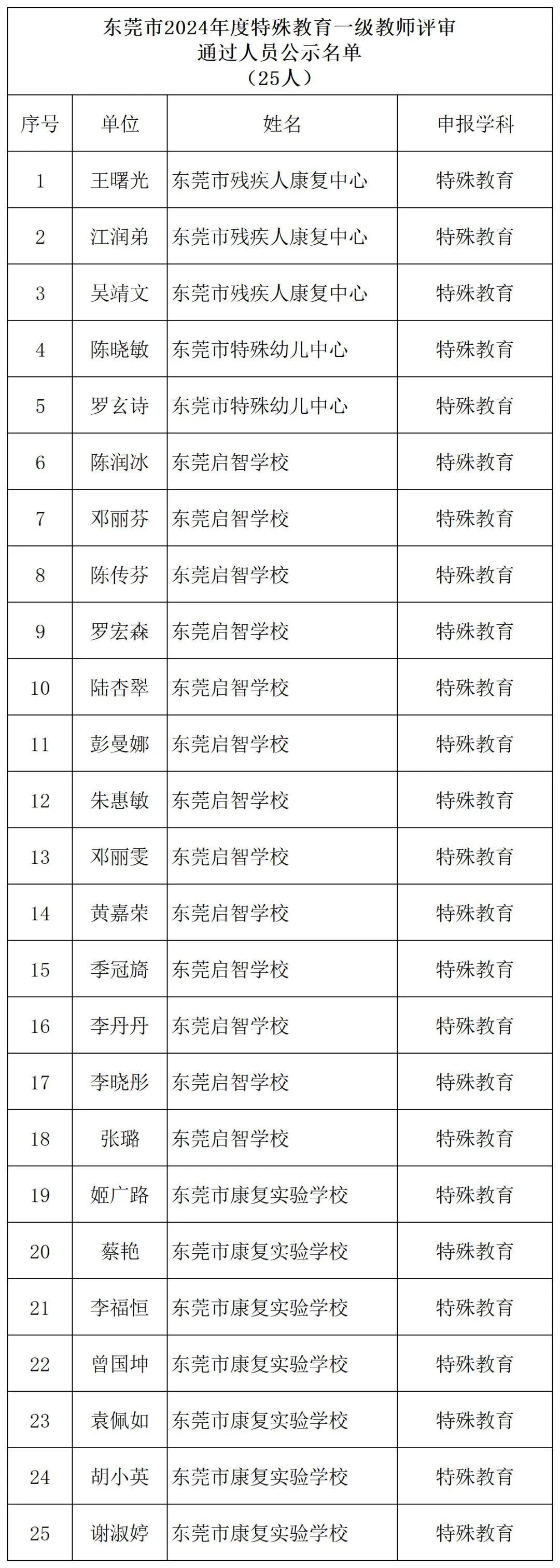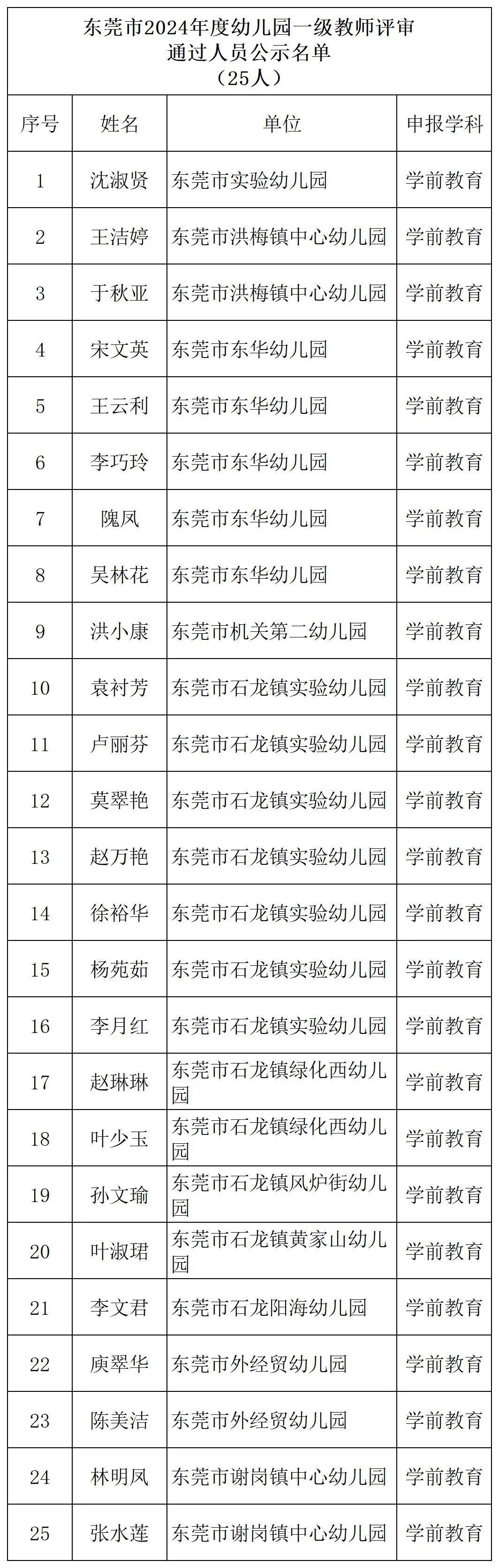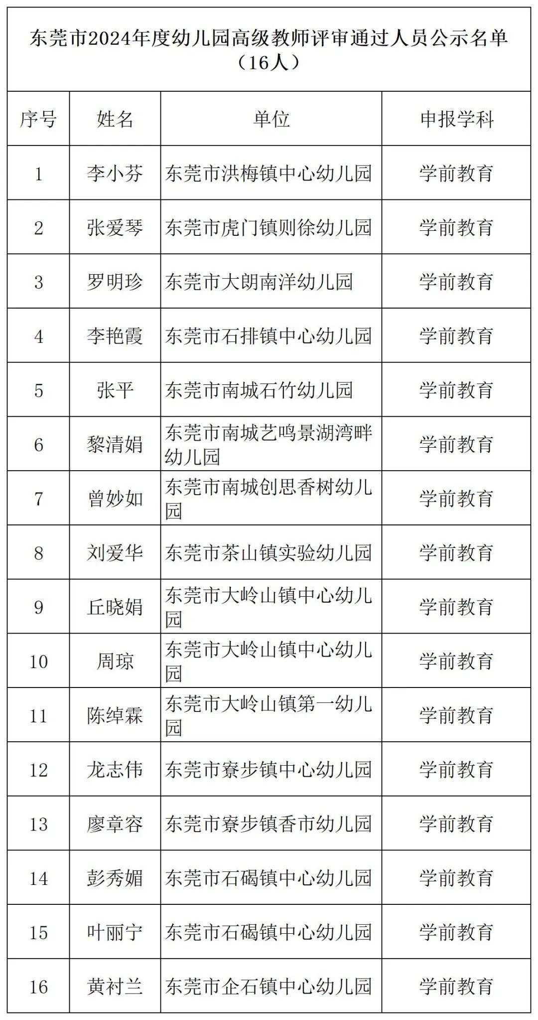经东莞市中小学教师高级职称评审委员会评审,下列人员通过中小学高级、中级教师职称评审,现予公示。公示时间从2025年7月3日至2025年7月9日止。若对通过人员取得资格有异议,请电话或书面向东莞市教育局人事科反映。反映的情况应有具体事实或证据,以个人名义反映的,应签署或自报本人真实姓名,并留下联系电话;以单位名义反映的,应加盖本单位公章。反映公示对象的情况和问题,应坚持实事求是的原则,不得借机诽谤和诬告。