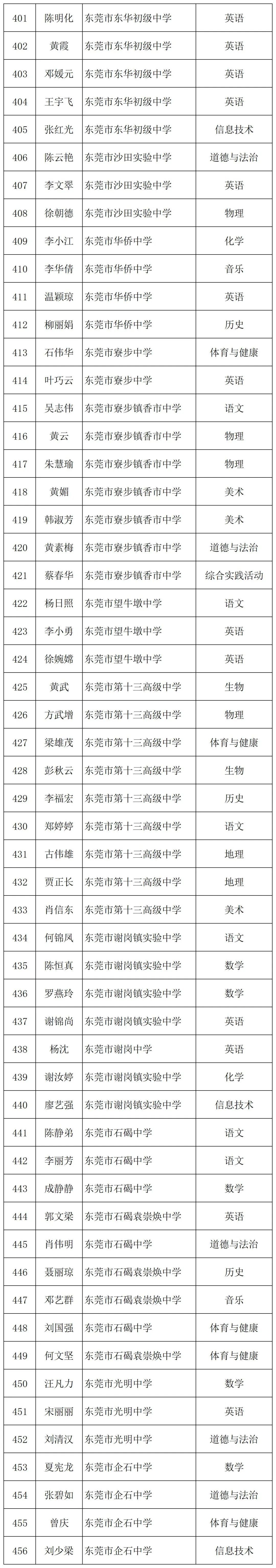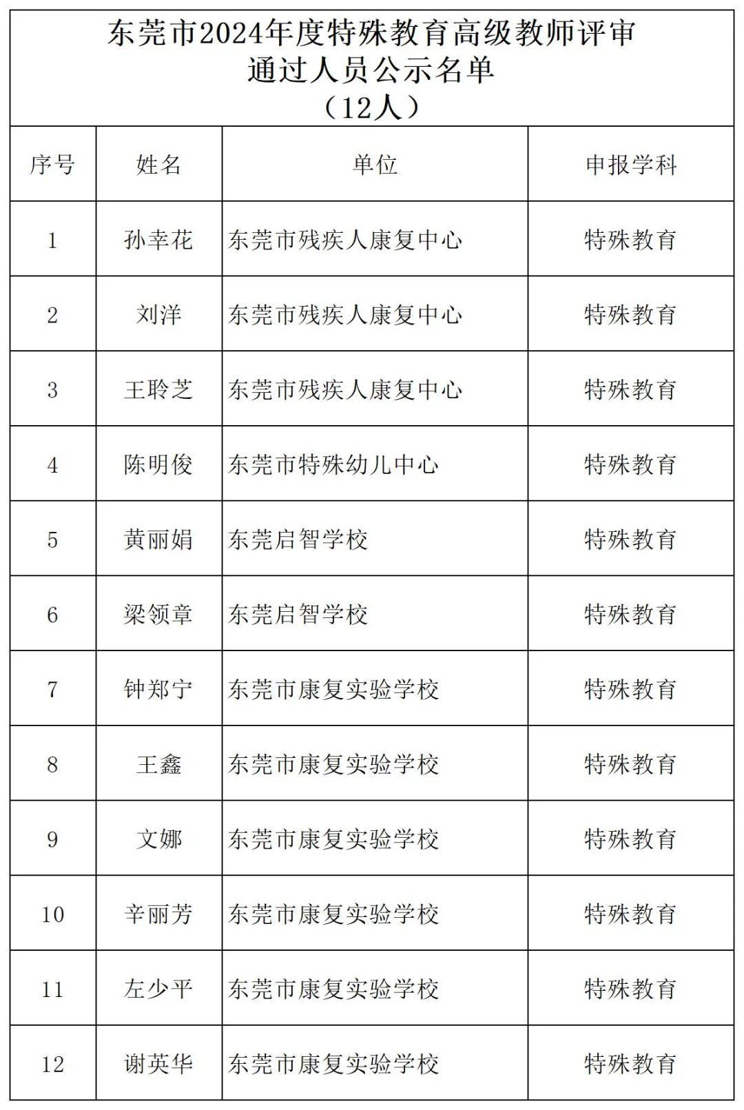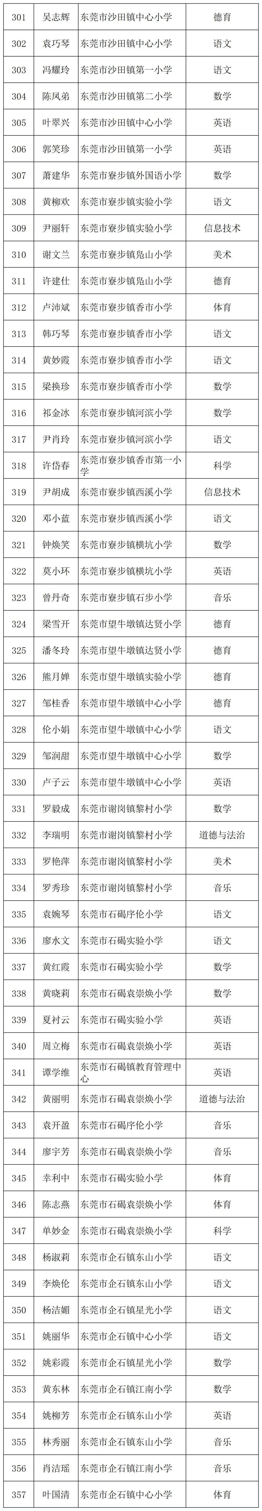经东莞市中小学教师高级职称评审委员会评审,下列人员通过中小学高级、中级教师职称评审,现予公示。公示时间从2025年7月3日至2025年7月9日止。若对通过人员取得资格有异议,请电话或书面向东莞市教育局人事科反映。反映的情况应有具体事实或证据,以个人名义反映的,应签署或自报本人真实姓名,并留下联系电话;以单位名义反映的,应加盖本单位公章。反映公示对象的情况和问题,应坚持实事求是的原则,不得借机诽谤和诬告。
