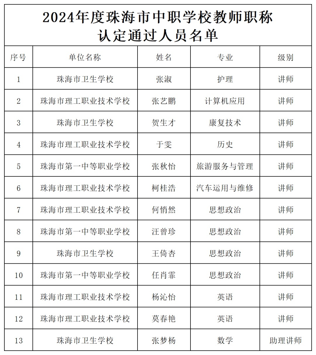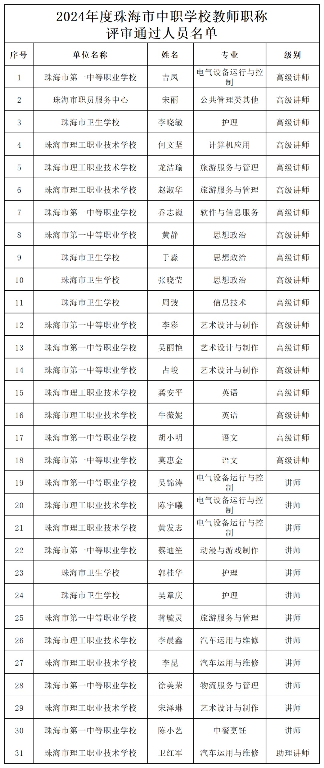 经珠海市中等职业学校教师系列高级职称评审委员会评审,下列人员通过2024年度珠海市中职学校教师职称评审(认定),现予公示。